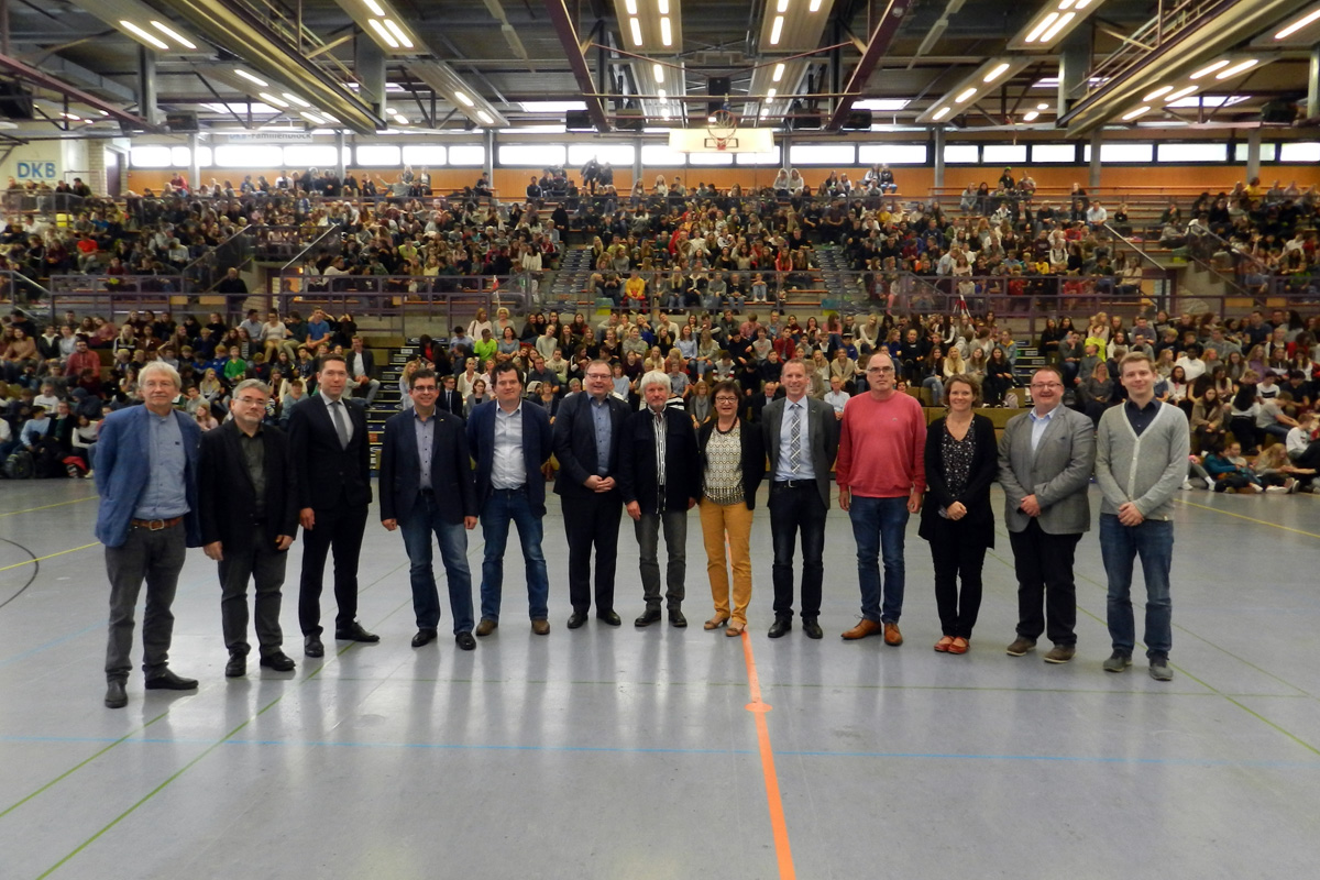 In einem feierlichen Festakt wurden die vielfältigen Ergebnisse anschließend in der mit über 900 Schülern, vielen aktuellen und früheren Lehrern gut gefüllten Eugen-Haas-Halle noch einmal präsentiert. Vom Plakat, über den Wortbeitrag, bis hin zum Sketch oder einer musikalischen Eigeninterpretation des bekannten Liedes „Haus am See“ von Peter Fox - die Schüler ließen ihren Ideen freien Lauf. Besonders viel Applaus bekamen dabei die beiden zehnjährigen Marty und Jamilia Leonie aus der fünften Klasse, die das Plakat ihrer Gruppe vor der stattlichen Kulisse vorstellten.