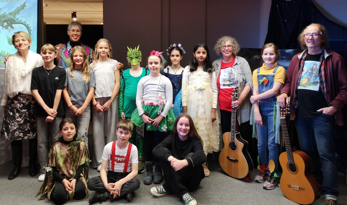Dabei wurden sie von einem kreativen Team begleitet und animiert, eigenständig und selbstverantwortlich ihr Stück "Abenteuer im Feenland" entstehen zu lassen. Die Musiker Ute und Friedemann Rink steuerten eigene Lieder bei, die die Kinder in ihr Stück eingebaut haben. Bei den Requisiten, wie den riesigen Blumen, dem Feuerdrachen und den Kostümen, standen Susanna Lindner und Carmen Leienbach zur Seite.