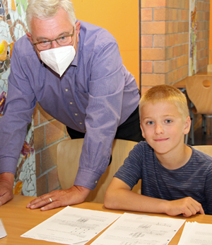 [Schulleiter Stephen Wittkampf freut sich mit dem bestplatzierten Leon Sudermann (GGS Wiedenest).]