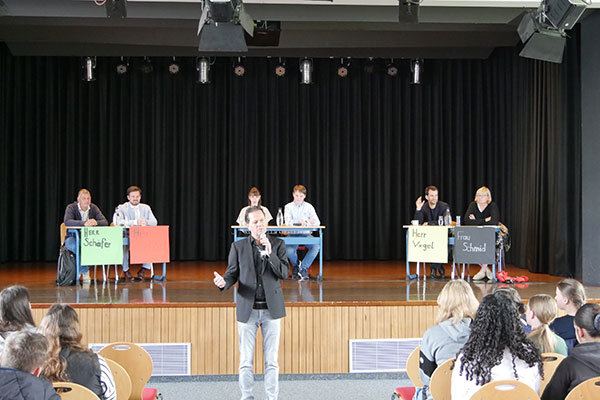 Politische Bildung ist in den vergangenen Wochen in der Städtischen Realschule Bergneustadt groß geschrieben worden. Zunächst fand laut Mitteilung eine Podiumsdiskussion mit Politikern verschiedener Parteien statt. Darunter waren Sebastian Schäfer (Bündnis 90 / Die Grünen), Pascal Reinhardt (designierter Bundestagskandidat der SPD), Johannes Vogel (Mitglied des Bundestages der FDP) und Heike Schmid (stellvertretende Vorsitzende der Frauen-Union Oberberg, CDU). Die Schülersprecherin Josefine Schulz organisierte die Veranstaltung mit Unterstützung der Lehrer und Schüler. Die Podiumsdiskussion wurde von Josefine Schulz und Nils Bergerhoff moderiert und geleitet. Auch haben die Schüler der Klassen 8 bis 10 die Fragen, die in die Moderation eingeflossen sind, gestellt und selbst erarbeitet. Anlass für die Diskussion war laut Mitteilung die anhaltende Politikverdrossenheit - gerade bei jungen Menschen. Neben Jugendpolitik wurde über deutsche und europäische Politik gesprochen.