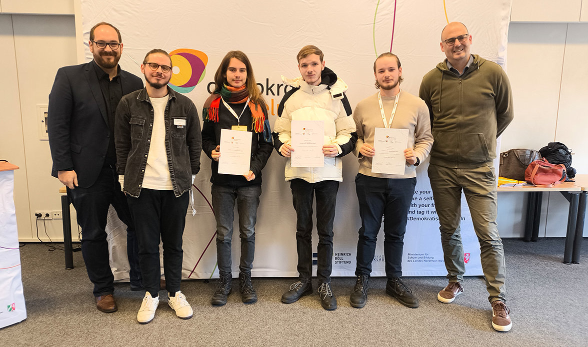 Die Schüler Philipp Pulster, Jakob Walter und Justin Boppenhäger vertraten ihr SV-Team Akademie Klausenhof in Hamminkeln. Schulministerin Dorothee Feller betonte in ihrem Grußwort die zentrale Rolle der Demokratiebildung in Schulen und lobte die Kreativität und den Einsatz der jungen Menschen.