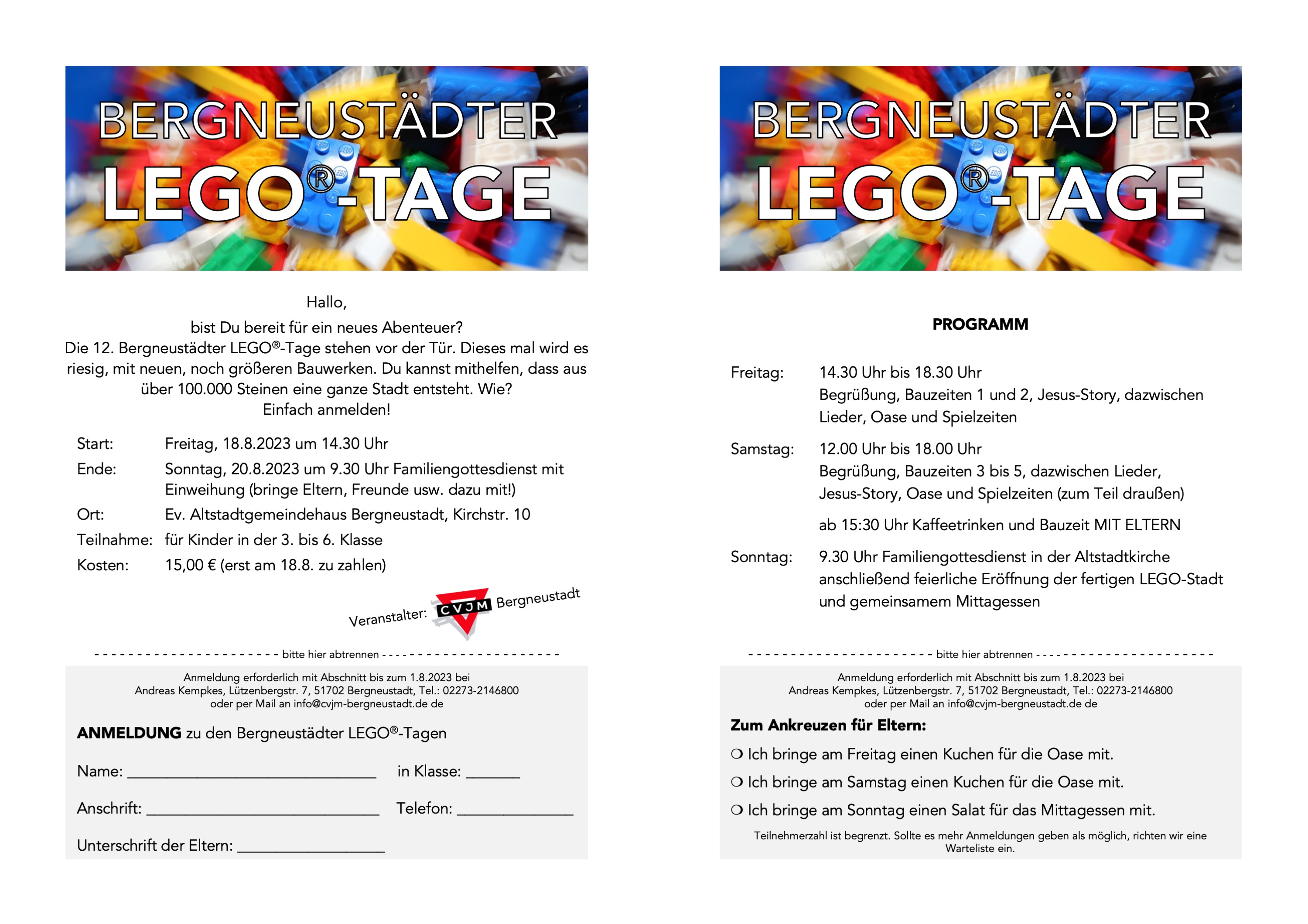 Von Freitag, 18., bis Samstag, 20. August, veranstaltet der CVJM Bergneustadt erneut die LEGO-Tage. Teilnehmen können Kinder im Alter von der 3. bis zur 6. Klasse. Die Veranstaltung findet im Evangelischen Altstadtgemeindehaus in der Kirchstraße 10 statt. Die Teilnahme kostet 15 Euro pro Person. Weitere Informationen sind hier zu finden.