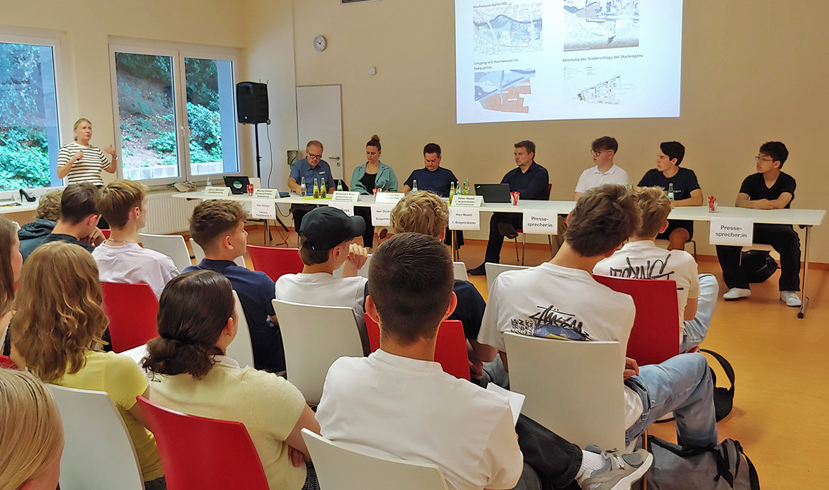 Auf dem Podium in der Mensa des Gymnasiums saß die Verwaltungsspitze mitsamt den Fachleuten aus der Stadtplanung. Die Bürgerschaft im Saal bildeten Schüler der Jahrgangsstufe 10. Sie hatten sich im Politikunterricht auf das Thema vorbereitet und nahmen nun verschiedene Rollen ein. Die Bandbreite reichte vom wohlwollenden Fragesteller bis zur hartnäckigen Kritikerin. Die Jugendlichen sollen lernen, wie demokratische Entscheidungsprozesse in der Kommune ablaufen. Die Initiative zu der Unterrichtsreihe war von Bürgermeister Ulrich Stücker gekommen, heißt es in der Verwaltungsmitteilung.