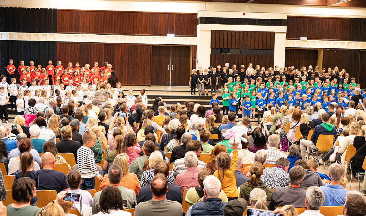 In der Aula des Schulzentrums Bielstein präsentierte die Musikschule der Homburgischen Gemeinden wieder ein buntes Konzert mit Erstklässlern der Wiehler Grundschulen, die an „Musik mit der Stimme entdecken“ teilgenommen hatten. Das Projekt wird von der Bürgerstiftung Wiehler Kulturgüter unterstützt – dieses Mal gab es zudem eine finanzielle Beteiligung der Sparkasse Gummersbach.