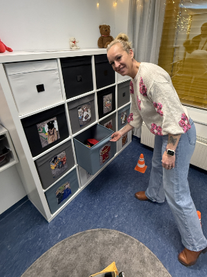 Aus einem Schrank können sich die Kinder dann verschiedene Kisten herausziehen, in denen dann Kostüme und Spielzeuge zu verschiedenen Berufen oder Tätigkeiten sind, z. B. Feuerwehrleute oder Bauarbeiter. „Die Sachen können aber auch zweckentfremdet werden. Zum Beispiel kann man den Hammer auch als Zauberstab nutzen“, fügte Norgall hinzu. Alle 110 Kinder aus den fünf verschiedenen Gruppen dürfen in dem neuen Bewegungsraum zusammen spielen.