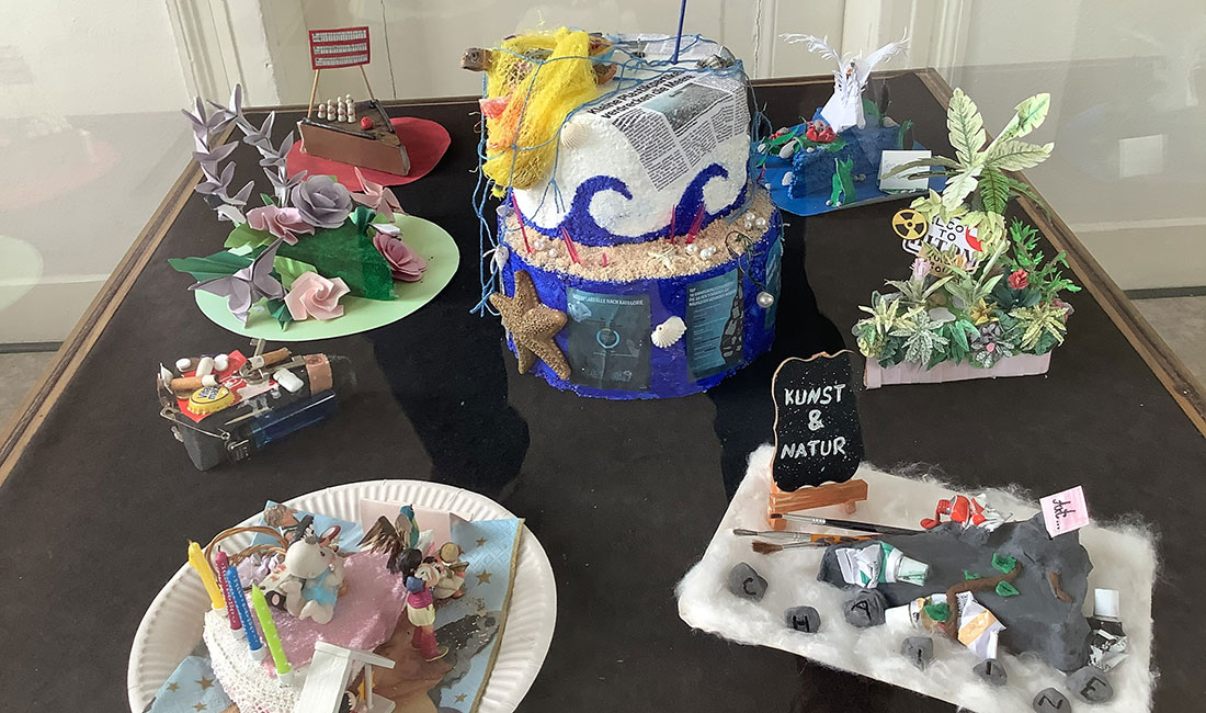 Nicht nur Vianne und Emilia aus der Klasse 6a fanden es „cool“ dabei zu sein und ihre „Müllmonster“ inmitten der rund 100 Exponate ihrer Mitschüler von der Gesamtschule Reichshof ausgestellt und gewürdigt zu sehen. Tatsächlich bot die Vernissage zur Ausstellung „Kaleidoskop – School-Art@Gallery“ im Kunstkabinett Hespert einen feierlichen Rahmen zur Schau der Schülerarbeiten.