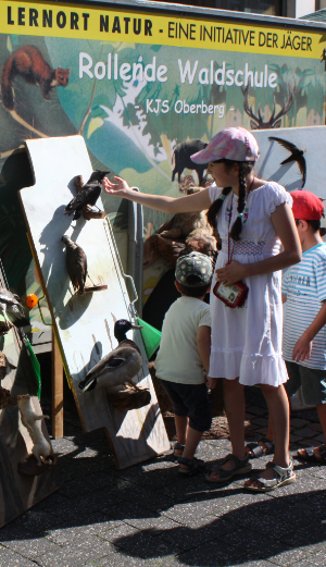 [Neben Präparaten von Rehkitzen, Fuchs Schnepfen oder Eisvögeln durfte man in der Rollenden Waldschule Wildschweinfelle und Geweihe anfassen.]