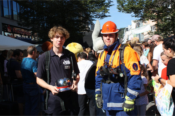 Ziemlich lang auch die Warteschlangen vor den zahlreichen Kinder-Schmink-Angeboten, wo die Verwandlung in einen Pokemon-Glurak, einen Batman oder die Zauberfee in Händen der geschickten Make-up-Artisten lag. Vor dem Sparkassengebäude wurde die kindliche Verwandlung per Fotoshooting für die Nachwelt erhalten. Mit Uniform samt Atemluftflaschen leicht als Mitglieder der Gummersbacher Jugendfeuerwehr zu erkennen, mischten sich Tillmann Klein (16) und Christian Stieglitz (15) in der Innenstadt unters Volk, um Werbung für ihr Ehrenamt zu machen. Als Jugendliche aus Elternhäusern, in denen das Gemeinwohl stets im Mittelpunkt stand, ist ihr Feuerwehr-Engagement nicht bloßer Selbstzweck, sondern erweitert ihre persönlichen Blickwinkel. „Nebenbei bekomme ich Einblicke in Maschinen und die Technik“, sagt Christian. „Hier lerne ich was fürs Leben“, ist sich Tillmann sicher.