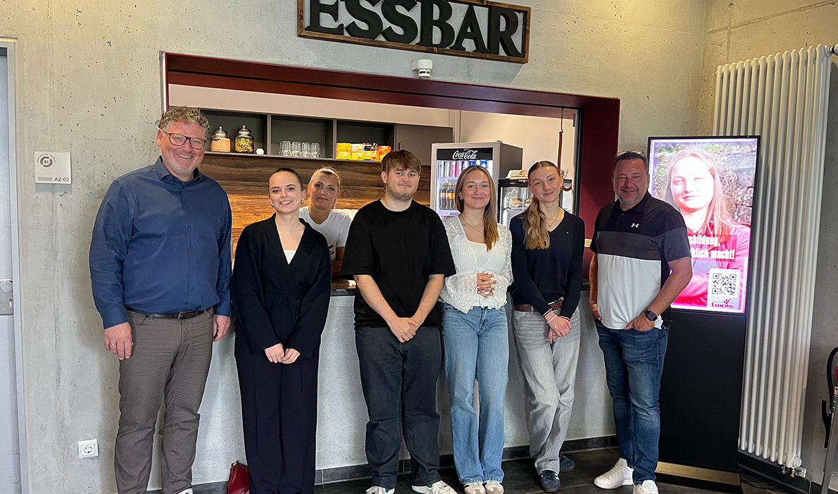 Neu ist, dass alle Schüler einen digitalen Schülerausweis haben, über den sie auch Office-Programme herunterladen können. Außerdem ist der Kiosk im Schulgebäude seit September 2024 wieder geöffnet. Giusy Vecchione wurde als neue Pächterin gewonnen und bietet in der „Essbar“ nationale und internationale Speisen und Getränke an – ein totaler Gewinn für die Schule, wie die Beteiligten meinen. Im Aufenthaltsraum vor dem Kiosk wurden neue Möbel mit Lademöglichkeiten aufgebaut. Darüber hinaus gibt es moderne Spinde sowie digitale Stelen mit Bildschirmen, die nicht zuletzt zur Berufsorientierung genutzt werden: zu sehen sind unter anderem Stellenanzeigen, die mit einem QR-Code versehen sind, über den die Schüler bei den Unternehmen ihre Handynummer hinterlegen können – und schon kann ein Kontakt hergestellt werden.