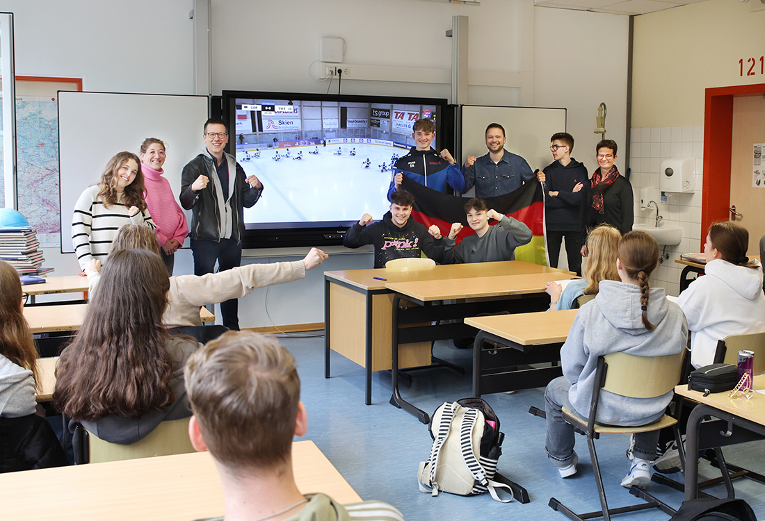 Eine besondere Schulstunde fand am Mittwoch am Bergneustädter Wüllenweber-Gymnasium statt. Statt sich mit Vokabeln, Stochastik oder Goethe zu beschäftigen stand für die Schüler der Q1 Livesteam schauen von der Para Eishockey-B-WM in Norwegen auf dem Stundenplan. Denn: Im norwegischen Skien kämpft vom 15. bis zum 20. April die deutsche Para Eishockey-Nationalmannschaft um den direkten Wiederaufstieg in den A-Pool. Mit dabei: Jano Bussmann vom TuS Wiehl. Der 17-Jährige ist Schüler des WWG und erstmals für ein großes Turnier nominiert, nachdem er im vergangenen Jahr noch zu jung war.