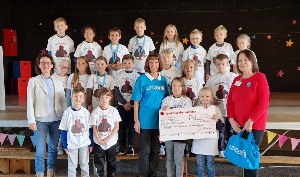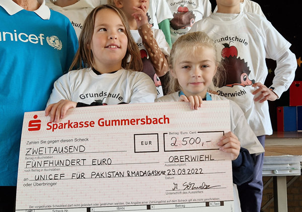 Mit ihrer Teilnahme an der bundesweiten Aktion „wir laufen für UNICEF“ haben die Schüler der Grundschule Oberwiehl das Ziel unterstützt. Im Vorfeld des Laufs suchten die Kinder Sponsoren, die für jede gelaufene Runde einen Betrag spendeten. Dabei kamen insgesamt 5.000 Euro zusammen. Die Hälfte des Erlöses verbleibt, so wie es bei den UNICEF-Schülerläufen üblich sei, in der Oberwiehler Grundschule. Die andere Hälfte werde nochmal halbiert. Ein Teil des Erlöses wird dem Schulprojekt Madagaskar zugeführt, der andere fließt der Nothilfe Pakistan zugunsten von der Flut betroffener Menschen zu.