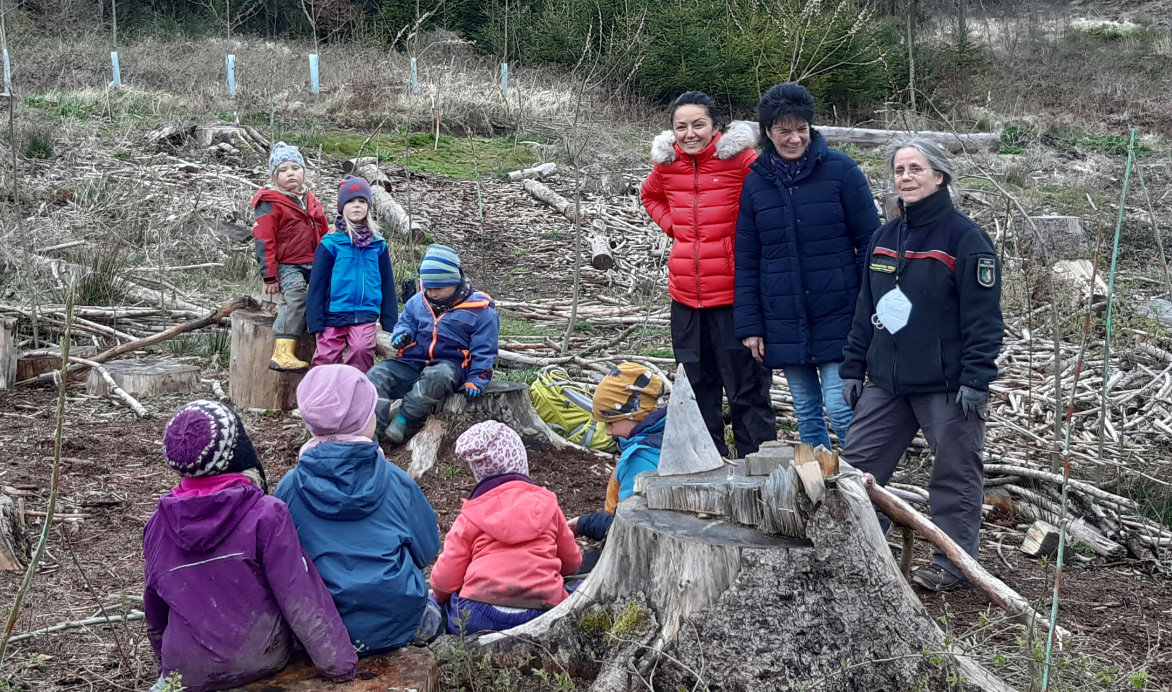 Bei all der Veränderung in ihrem Waldstück war Höhepunkt des Besuchs vom Forstamt der Bau eines Weidentipis mit Hilfe von Revierförsterin Andrea Rösch. Auch wenn es eine Zeit dauern wird, bis die Setzlinge zu Weidenbäumen geworden sind, Aktivitäten im in den Grundzügen angelegten Tipi stehen jetzt schon fest auf der Agenda. Außerdem kam der Experimentiertisch in der Mitte des künftigen Tipis zum Einsatz. Dort untersuchten unsere Kinder mit einer Lupe alles, was der Wald zu bieten hat – Würmer, Insekten, Blätter, Samen.