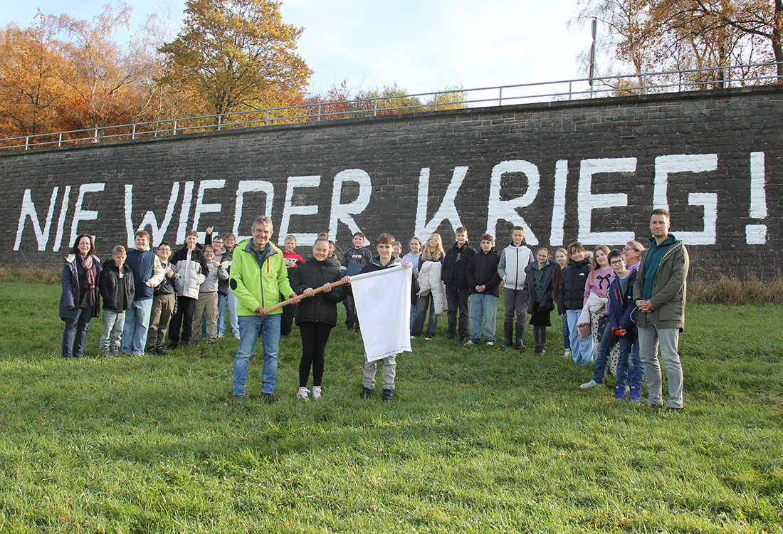 Ein deutliches Zeichen für Frieden haben die Schülerinnen und Schüler der Gesamtschule Waldbröl am Donnerstagmittag gesetzt. Zunächst wurde der Klasse 6c an der Waldbröler Friedensmauer eine weiße Fahne der Initiative „Weg der weißen Fahne“ übergeben, anschließend formten Schüler das Peace-Zeichen auf dem Schulhof. Mit dieser Aktion möchte die Schule Vergangenheit und Gegenwart verbinden und das Engagement der Schülerinnen und Schüler für Frieden und Erinnerungskultur sichtbar machen.