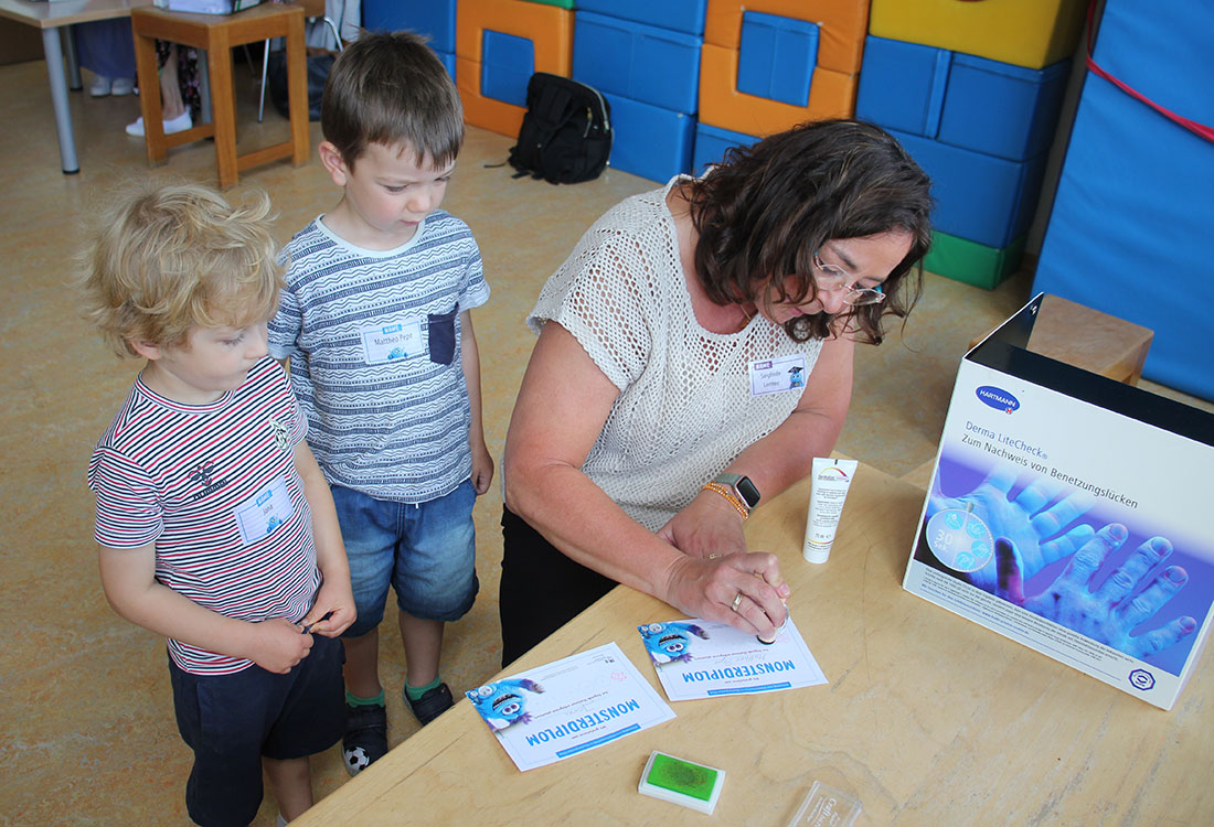 Besonders viel Spaß hatten sie aber bei der Station von Sieglinde Lemmer. Bei ihr durften sich die Kinder „Zauberdreck“ an die Hände reiben. Unter UV-Licht war der „Dreck“ klar zu erkennen. Anschließend wurden sie zum Händewaschen geschickt – und durften danach selbst unter dem UV-Licht überprüfen, wie gründlich sie dabei waren.