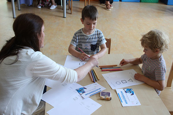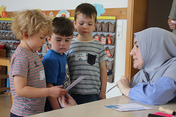 Viele der Vierjährigen waren bei ihrem Flur-Parkour mit Eifer bei der Sache. Anfangs wurde ihr Impfpass und ihr U-Heft überprüft. Im Tausch gab es das Monsterdiplom und den ersten Stempel, um dieses zu bestehen. Weitere fünf konnten an den folgenden Stationen gesammelt werden. Ähnlich wie bei den vorgeschriebenen Kinderuntersuchungen oder später auch bei den Schuleingangsuntersuchungen durften die Vierjährigen malen, hüpfen oder auch Fantasieworte nachsprechen, womit Fein- und Grobmotorik, Sprachfähigkeiten sowie die allgemeine Entwicklung getestet wurden. Begleitet wurden sie dabei von Kinderärztin Tatjana Schäfer, Projektkoordinatorin Kübra Bidil und Fachpersonal des Gesundheitsamts.