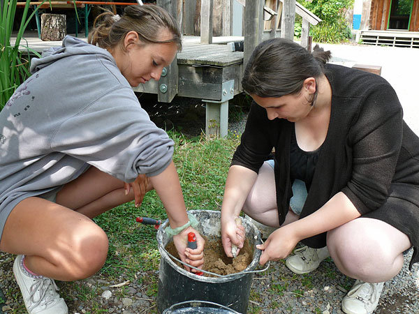 [Helena und Mariela sorgen für die ideale Viskosität des Lehmklebers, mit dem Reet und Holzspäne im Bienenhotel befestigt werden.]
