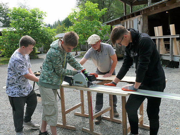 Unter Anleitung von Michael Thielen (VSB) wurden ab heute die theoretischen Pläne von Bienenhotel, Fühlkisten und Baumstamm-Karussells für den Jhb-Sinnengarten n die Praxis umgesetzt. "Erst hatten alle Manschetten vor der Handhabung der Tauchsäge, aber wenn man sie mit beiden Händen entlang der Führungsschiene führt, geht alles klar", weiß Holz-Fachmann Thielen.