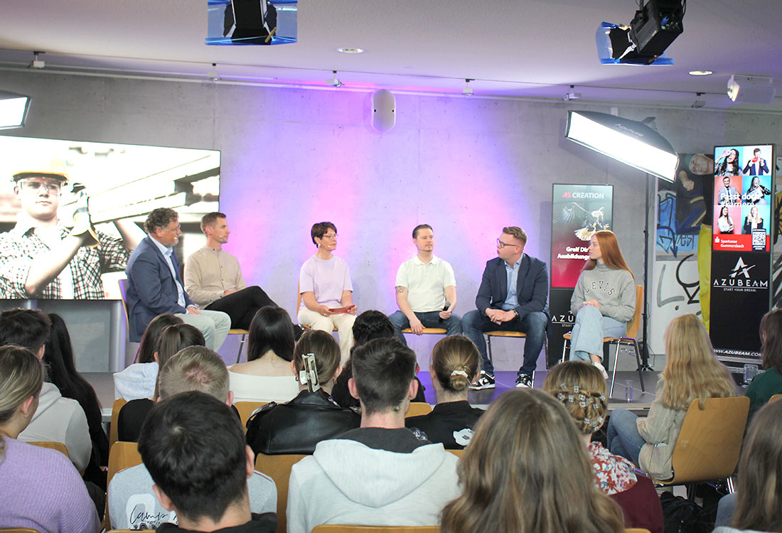 Neben Herbst und Eckardt nahmen auf dem Podium auch KBKO-Leiter Rainer Gottschlich, Daniel Gerz, Ausbildungsleiter bei Rüggeberg (PFERD) sowie die Schülerin Maja Spieckermann und Yannik Koers Platz. Letzterer musste sich während der Pandemie nach beruflichen Möglichkeiten umschauen – und hatte bei der Kreissparkasse Köln eine Stelle gefunden. Während die Berufsfelderkundungen für ihn zu früh kamen, holten ihn vor allem die digitalen Bewerbungsangebote der Sparkasse ab, erzählte er.