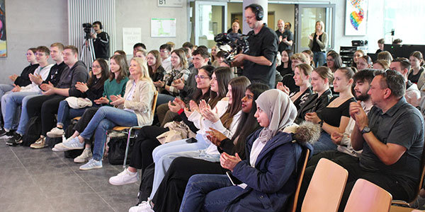 Nachdem die Pilotphase erfolgreich abgeschlossen worden sei, stehe die Azubeam-Stele bereits in mehr als zehn Schulen – und jede Schulform sei dabei bereits vertreten, sagte Jan Eckardt. Zwölf Unternehmen machten so bereits Werbung, weitere befänden sich bereits in der Pipeline. Das Aufstellen der Stele sei innerhalb kürzester Zeit möglich und auch ein Clip für die Betriebe sei schnell und einfach produziert. „Wir wollen Azubeam jetzt weiter ausrollen.“ Informationen für Schulen und Betriebe gibt’s hier.