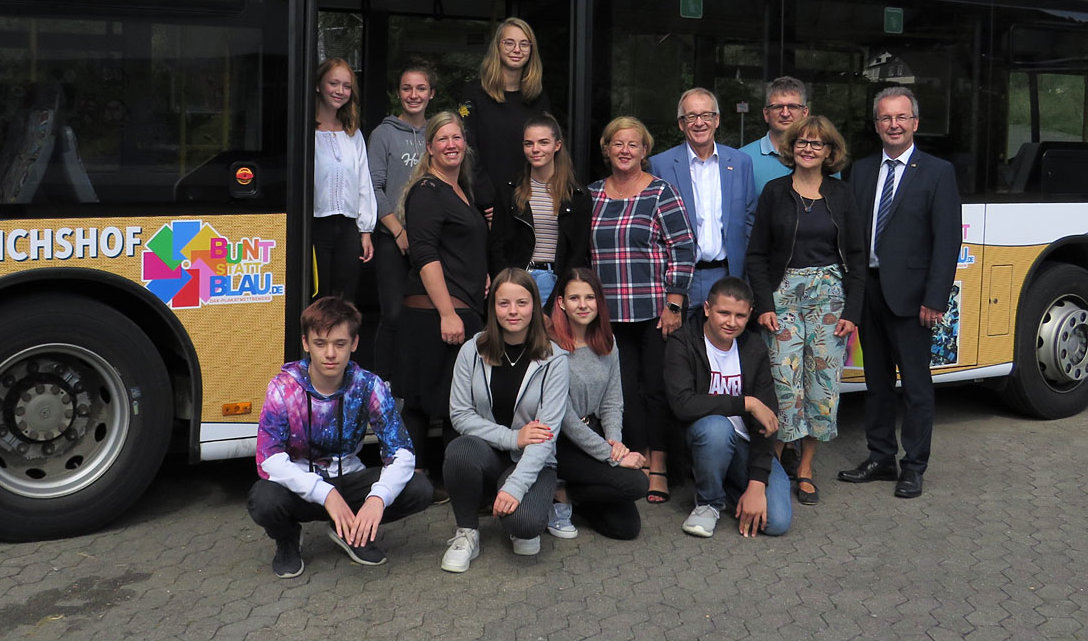 Der bundesweite Kunstwettbewerb „bunt statt blau“ der DAK ruft Schüler im Alter von 12 bis 17 Jahren dazu auf, mit Plakaten kreative Botschaften gegen Alkoholmissbrauch zu entwickeln. Teilgenommen hat auch die ehemalige neunte Jahrgangsstufe der Gesamtschule Reichshof. Auf Initiative der Schulleiterin Anne Halfar und Kunstlehrerin Nora Ernst entwarfen die Schüler im Rahmen des Unterrichts künstlerische Darstellungen, die auf die Schattenseiten des Alkoholkonsums hinweisen. Die besten Arbeiten schmücken ab sofort einen Linienbus der OVAG. Schulleiterin Halfar zeigt sich begeistert vom Engagement ihrer Schüler und der Verkehrsgesellschaft und stimmte Bürgermeister Rüdiger Gennies zu, der klarstellt: „Wenn sich ein Genussmittel zu einem Gift entwickelt, welches Leben bedroht und soziale Beziehungen gefährdet, hört der Spaß definitiv auf. Mit einer solchen Präventionsmaßnahme darauf aufmerksam zu machen, ist heutzutage wichtiger denn je“.