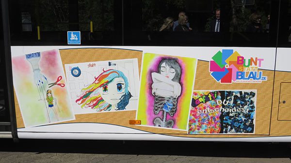 Der Linienbus wurde bereits zum sechsten Mal mit „bunt statt blau“-Kunstwerken verziert, denn er wird jedes Jahr neu bedruckt. Im nächsten Jahr werden also die Arbeiten einer anderen Schule auf dem Bus zu finden sein. Der OVAG-Bus ist in ganz Deutschland der erste und einzige seiner Art.