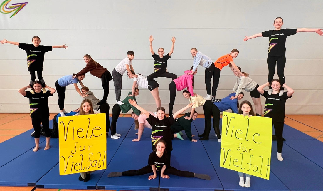 Das Homburgische Gymnasium Nümbrecht hat mit Sprühkreide aus ihrem Schulhof ein riesiges Kunstwerk geschaffen, das die Haltung gegen Rassismus bunt und mehrsprachig verdeutlicht. Die Gesamtschule Reichshof stellte sich sportlich-akrobatisch auf und verdeutlichte die Haltung gegen Rassismus und für eine vielfältige Gesellschaft.