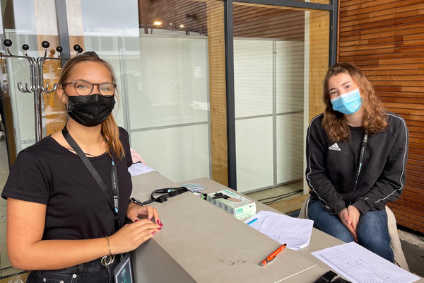[Lara Vieth (li.) organisierte das "Career Dating". Ihre Kollegin Mia Beutelstahl war im vergangenen Jahr selbst noch Besucherin und empfing heute die Gäste am Eingang als neue Lang-Auszubildende.]