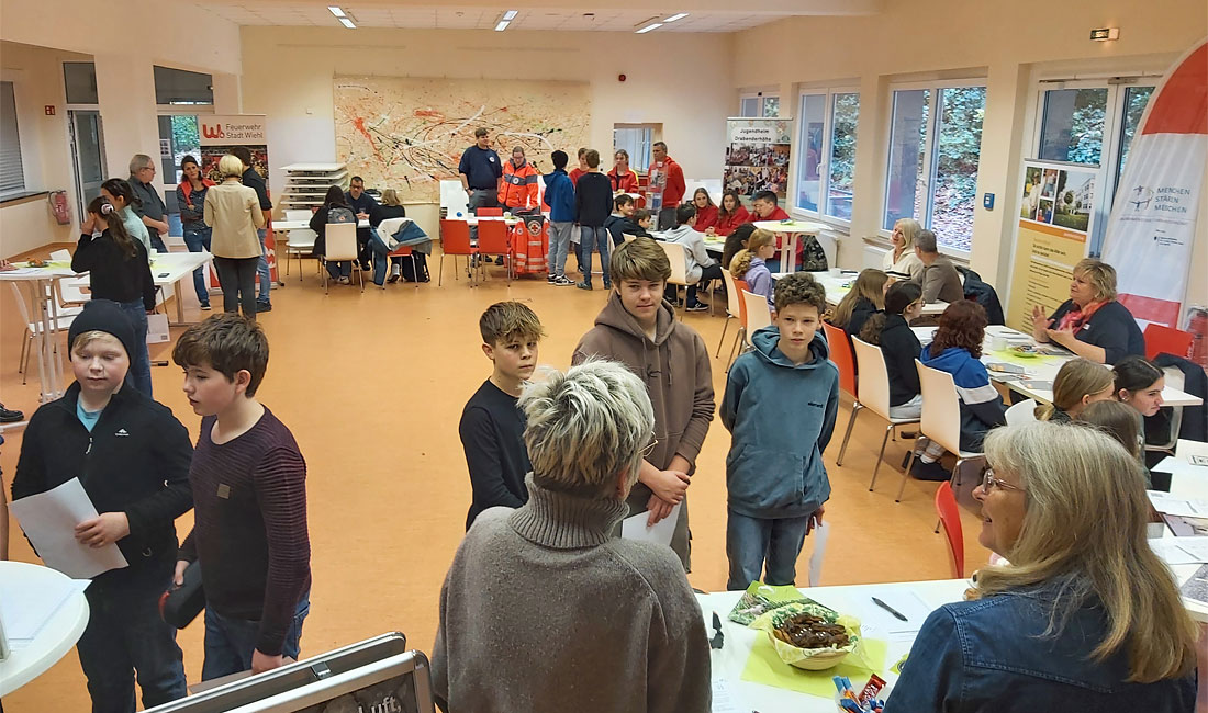 Rund 100 Schüler der Jahrgangsstufen acht bis elf lernten ein Dutzend Akteure kennen, die sich bürgerschaftlich engagieren, darunter das Rote Kreuz, die DLRG, die Jugendfeuerwehr Wiehl, die Caritas und das Tierheim Koppelweide. Auf einem Markt der Möglichkeiten in der Mensa des DGB, präsentierten die Einrichtungen ihr Angebot.
