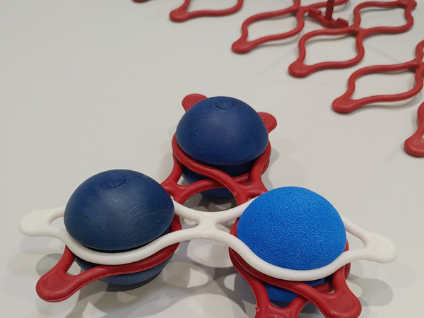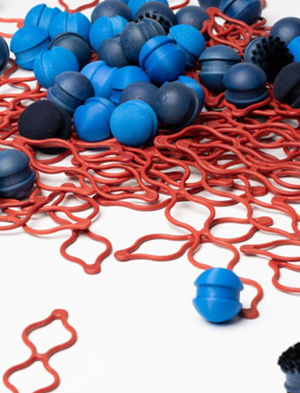 Neben dem spritzgegossenen Kunststoffteil besteht das Spielgerät aus weiteren Komponenten: Blaue Kugeln, die zwar alle gleich groß und geformt, aber in sieben unterschiedlichen Materialausführungen angelegt sind. Neben Holz, Baumwolle und Filz, Schaumstoff, Silikonkautschuk und Latex kommen die Kinder auch mit einer Bürstenoberfläche in Berührung.
