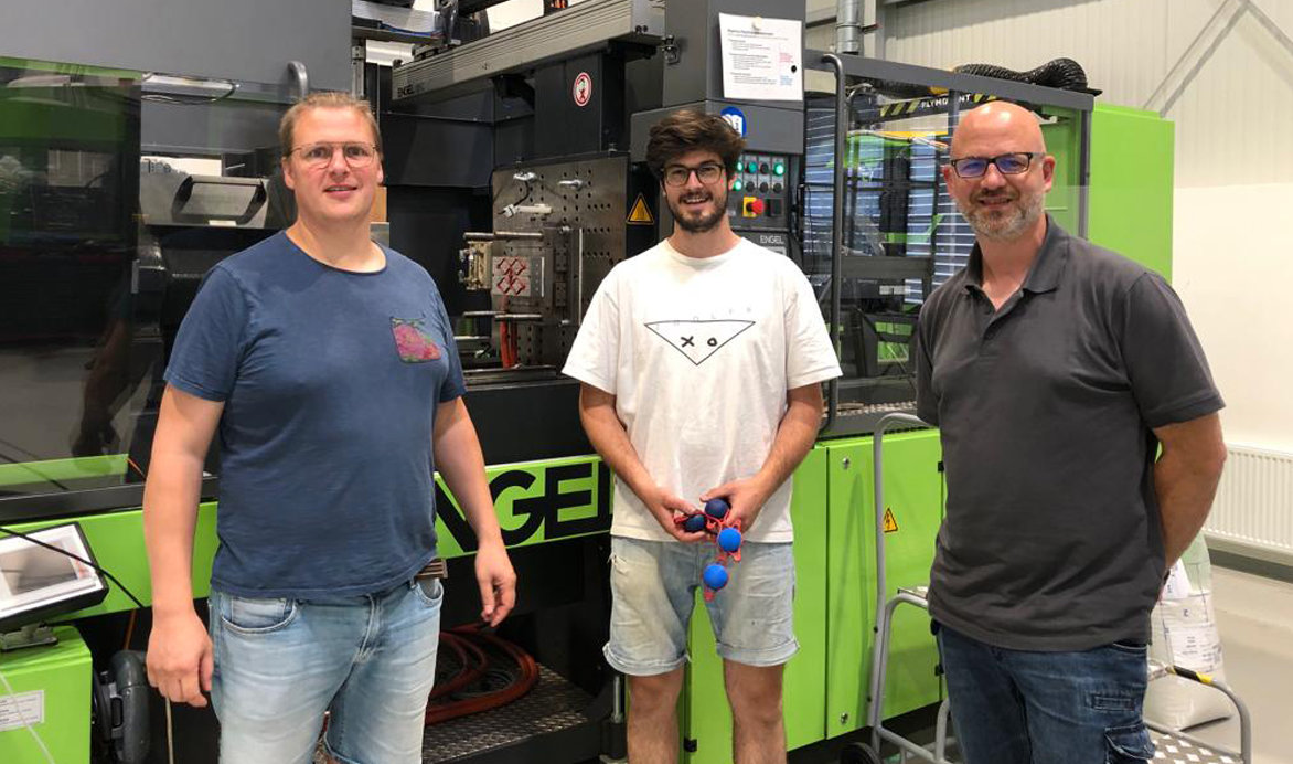 Bei der Produktion erfuhr der Jungdesigner Unterstützung von der TH Köln. Fabian Jasser aus dem Polymer-Labor konstruierte die Formeinsätze, welche im Innovation Hub Bergisches Rheinland von Christoph Becker gefräst wurden. Die Halbzeuge stellte das Labor für automatisierte Fertigung zur Verfügung. Dr. Michael Stricker (ebenfalls Polymer-Labor) koordinierte die Aktivitäten. Drei Wochen später war es dann soweit: Im Polymer-Labor wurden die Spielzeugkomponenten im Spritzgießverfahren hergestellt.