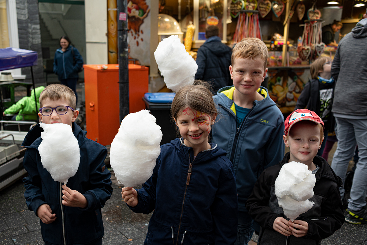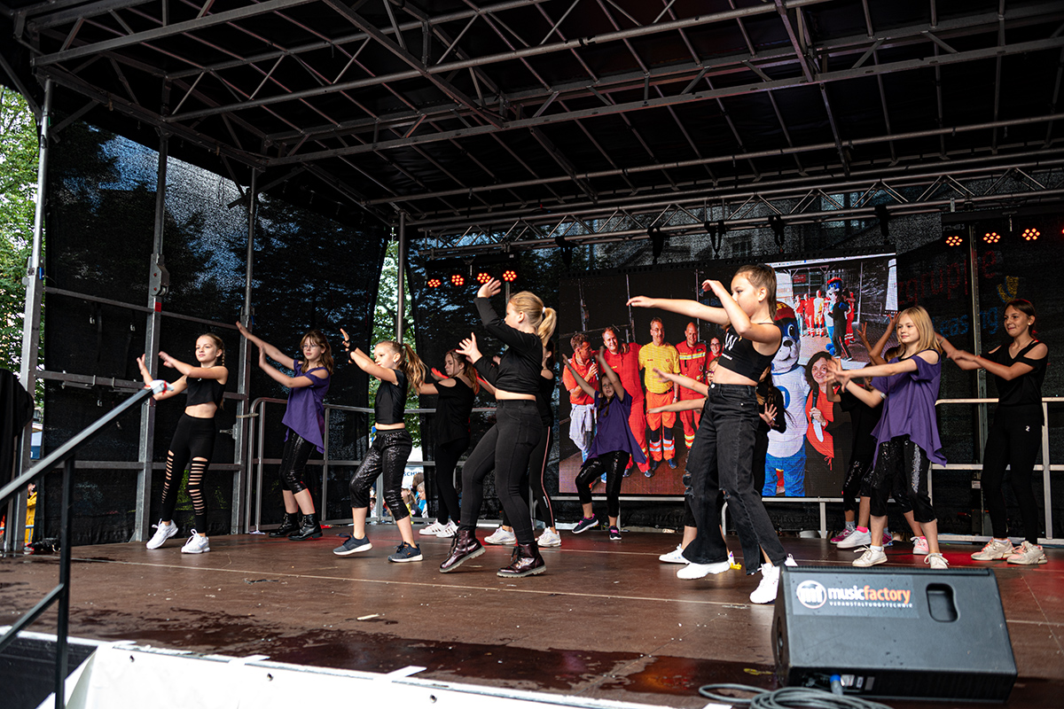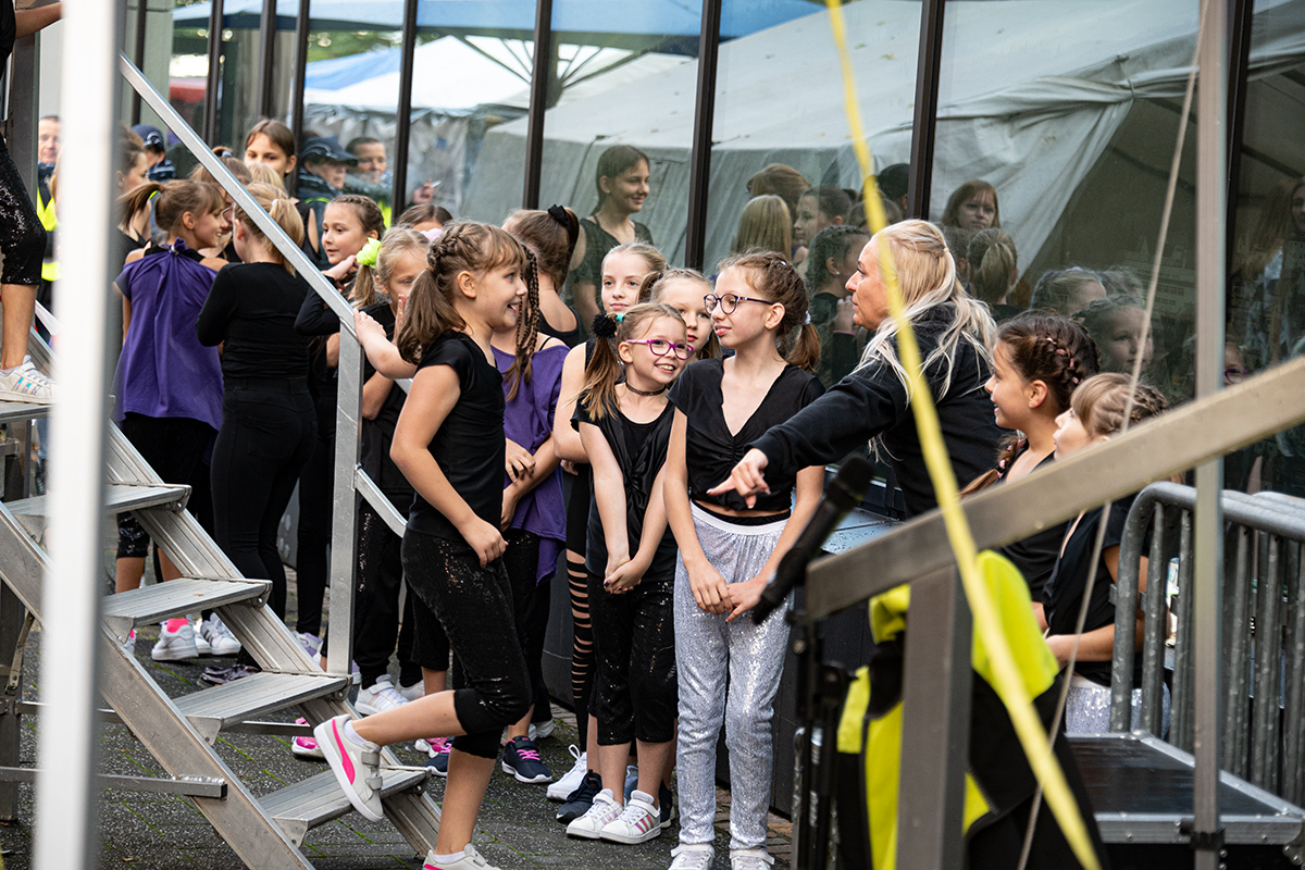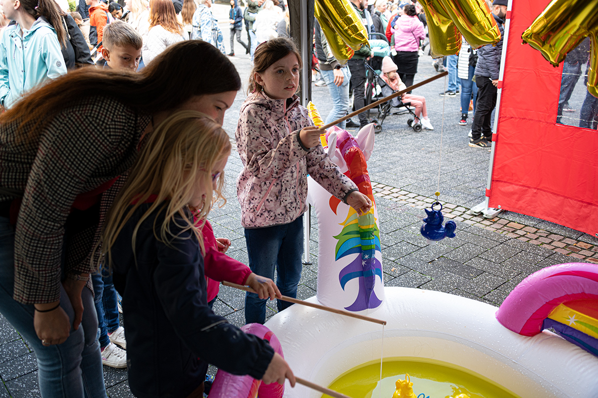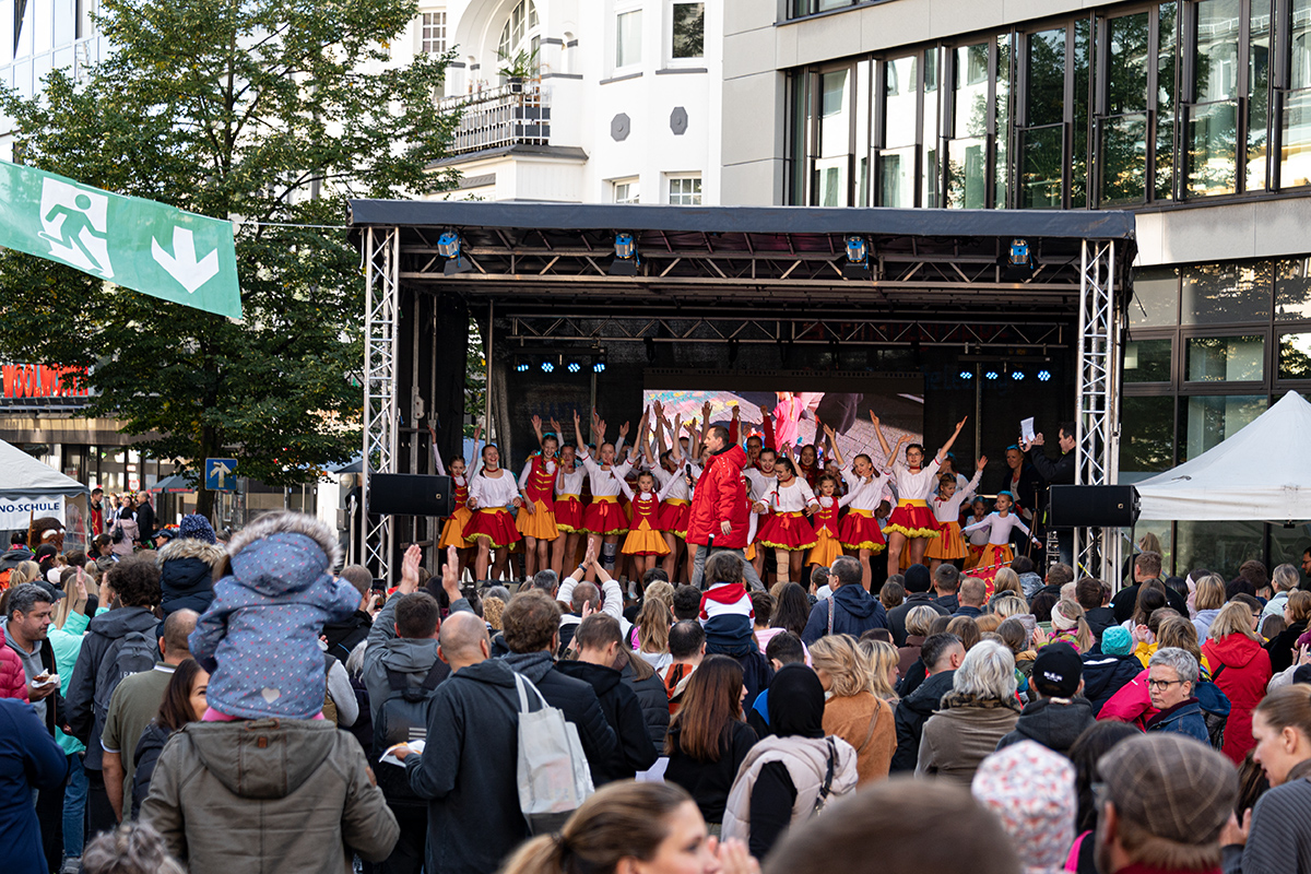 Um halb 12 Uhr ging es los. Die ersten Kinder saßen auf dem nostalgischen Karussell oder bevölkerten die Hüpfburg. Der Kinderflohmarkt und die Spielstraße „Fest der Farben“ öffneten und auf der Bühne startete das Programm „Kids on Stage“. Angefangen mit „Die Tanzmäuse“ des Katholischen Familienzentrum St. Raphael, über die Schüleraktion „Rund um das Thema Müll“ der GGS Steinenbrück, den „Kintertanzmaxis“ und der Tanzgruppe „Unlimited“ der Tanzschule Kasel, bis zum Liveact mit Mike Singer am Schluss. Moderator des Bühnenprogramms André Kasel führte perfekt durchs Programm und sorgte zusätzlich für gute Stimmung – trotz Regenschauer. Zwischendurch dazu mehrfach eine Live-Berichterstattung der Schülerredaktion der GGS Steinenbrück.