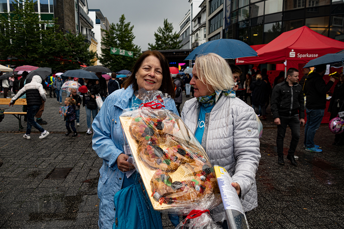 Bunt auch die kleinen Enten, die von den Kindern geangelt werden konnten und an einem anderen Stand wurden Steine angemalt. Viele Infostände – von Musikschule Gummersbach, über die Freie Waldorfschule Oberberg, bis zur UNICEF säumten die Innenstadt. Ein besonderer Erfolg an diesem Tag war die Aktion „Recycling für die Ukraine“. 2.500 Euro als Erlös kamen mit den Pfandflaschen, gesammelt von Gummersbacher Kinder in den vergangenen Wochen, zusammen, die Renate Koutawas von der UNICEF Arbeitsgruppe Oberberg auf der Bühne entgegennehmen durfte.