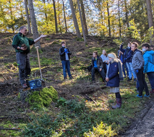 [Forstwirt Guido Hennig erklärt den Schülern, wie sie die Pflanzen mit den Werkzeugen entnehmen.]