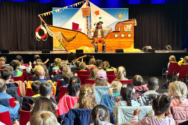 Mit „Jolinchens Seereise - Leinen los!“ ging man in der Gummersbacher Halle 32 noch einen Schritt weiter und unternahm mit rund 500 Kindern aus zwölf oberbergischen Kitas in drei Vorstellungen einen praktischen Bewegungs- und Wissensexkurs mit ebenjenem AOK-Maskottchen, den Matrosen Möhrchen und Öhrchen, der schlauen Henriette und dem Piratenkapitän Coock mit seinem Papagei Klappe.