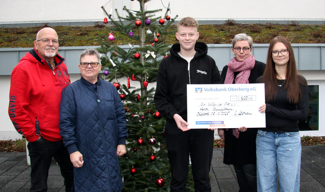 Auch in diesem Jahr hat die Städtische Realschule Waldbröl wieder die „Wunschbaumaktion“ des Waldbröler Vereins „Wir helfen vor Ort“ unterstützt. Auf Anregung der SV und organisiert durch die Lehrkräfte Heike Lüghausen und Maurice Barbehön, wurde an sechs Tagen ein Kuchenverkauf organisiert, bei dem jeder Jahrgang sich einmal engagiert hat. Auf diese Weise kam eine beachtliche Summe zusammen, so dass im Namen der Realschule Waldbröl 600 Euro an den Waldbröler Verein gespendet werden konnten. Der Schulsprecher Luis Kiebler und seine Stellvertreterin Felina Müller überreichten den symbolischen Scheck.