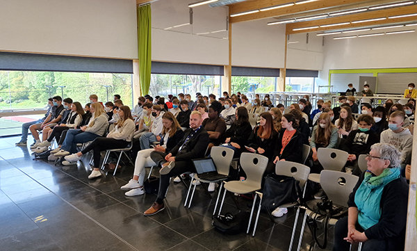 Nachdem anschließend auch über die Waffenlieferungen an die Ukraine kontrovers diskutiert worden war, beendete Gisela Mengelberg die Podiumsdiskussion, die in den kommenden Wochen im Schulunterricht weiter aufgearbeitet werden soll. Warum sie ausgerechnet der Stufe 9 die Gelegenheit gegeben hatte, die Landtagskandidaten zu löchern, beantwortete sie mit einem Versprechen an die Schüler: „Sie waren auch in die Vorbereitung für die Podiumsdiskussion zur Bundestagswahl involviert, konnten aus pandemischen Gründen aber nicht daran teilnehmen.“ (Anm.d.Red: Im vergangenen Jahr diskutierten die Politiker nur mit Oberstufenschülern in der Eugen-Haas-Halle). „Außerdem hat diese Stufe die Friedensdemonstration zum Ukraine-Krieg mit vorbereitet und dort Reden gehalten. Wenn junge Menschen schon so politisch aktiv sind, war es mir wichtig, dass sie auch eine solche Veranstaltung mitmachen können.“