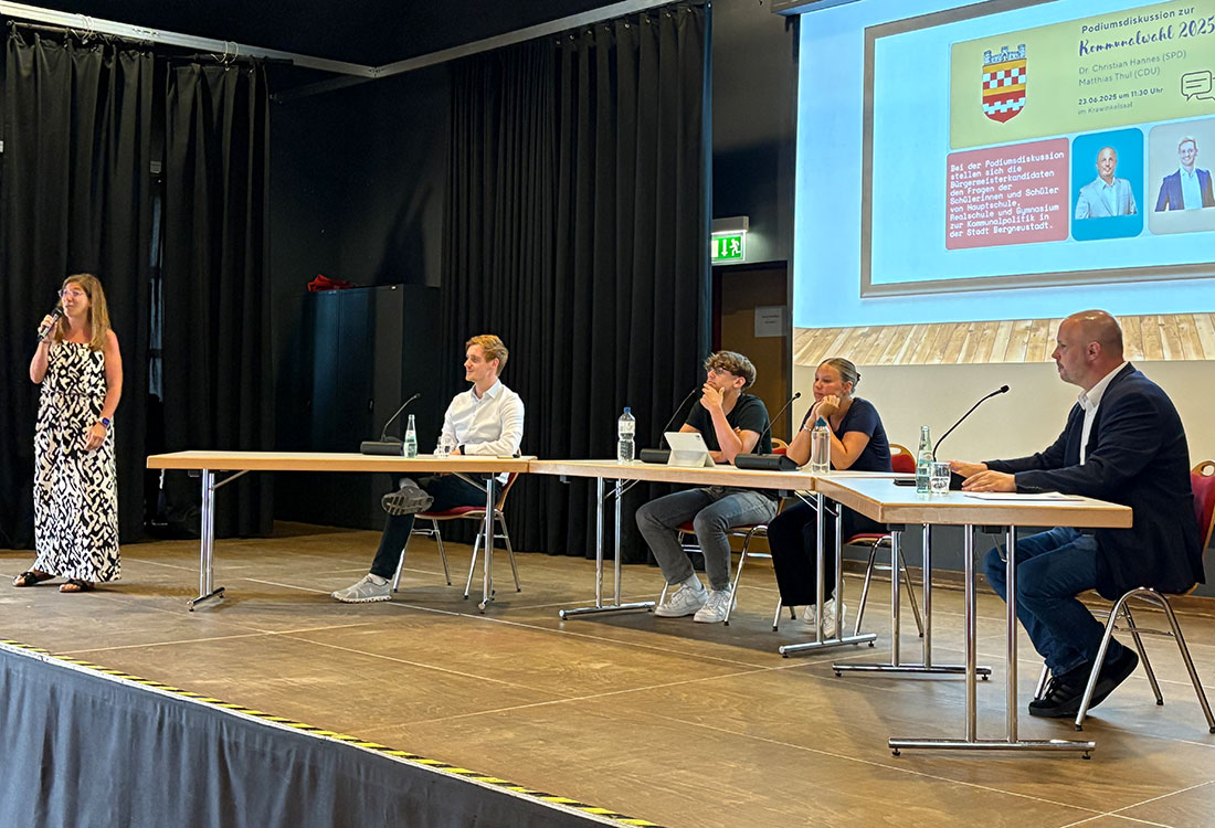 Bergneustädter Schülerinnen und Schüler der Jahrgangsstufen 9 bis 12 haben am Montagvormittag im Krawinkelsaal mit zwei der drei Bürgermeisterkandidaten der Stadt Bergneustadt, Dr. Christian Hannes (SPD) und Matthias Thul (CDU), diskutiert. Der Bürgermeisterkandidat Jens Holger Pütz (UWG) war verhindert. Organisiert hatte den einstündigen Austausch die Fachschaft Sozialwissenschaften des Wüllenweber Gymnasiums. Nach einer kurzen Begrüßung durch die Lehrkraft Sarah Lemmer-Kahlert sowie einer Vorstellungsrunde der beiden Kandidaten ging es zunächst um zehn vorab eingereichte Schülerfragen, im Anschluss durften die Haupt- und Realschüler sowie Gymnasiasten aus dem Plenum Fragen stellen. Moderiert wurde die Veranstaltung von dem Schüler Jonas Stracke und der Schülerin Lena Hagen.