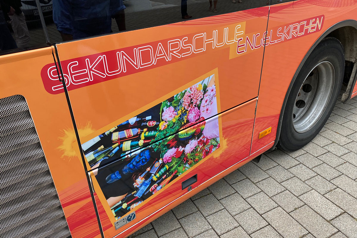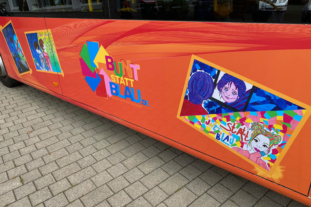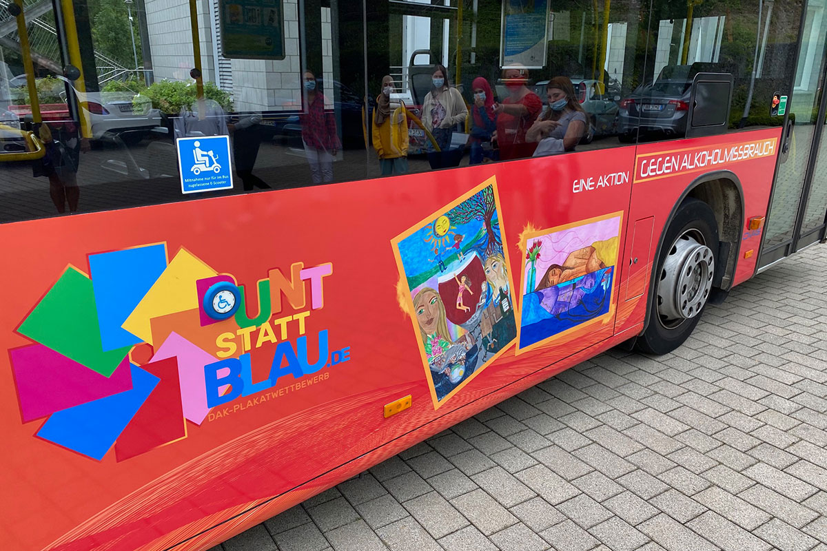 Laut NRW Statistik wurden 2017 allein im Oberbergischen 84 Zehn- bis 20-jährige nach Rauschtrinken in eine Klinik eingewiesen - Tendenz steigend. Deshalb setzt die Krankenkasse DAK in Zusammenarbeit mit der OVAG im Rahmen des Projektes „Bunt statt Blau“ seit sieben Jahren auf die Kooperation mit Schulen. Jedes Jahr schmücken dabei Jugendliche einen Bus der Verkehrsgesellschaft mit selbsterstellten Bildern. In diesem Jahr sind acht Schülerinnen der Sekundarschule Engelskirchen Urheberinnen der Kunstwerke.