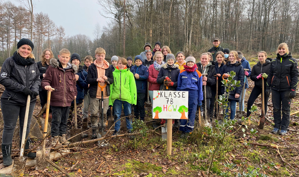 „Sie wollten nicht nur auf die Straße gehen und für ein besseres Klima demonstrieren. Sie wollten hier in Waldbröl direkt etwas tun“, stellt Daniela Galfeld, Politiklehrerin am Hollenberg-Gymnasium Waldbröl, klar. Mit der 7b arbeitete die Lehrerin die Unterrichtseinheit „Sich ehrenamtlich engagieren“ durch, wobei von den Schülern zahlreiche Projekte erarbeitet worden seien. „Aber nur ein Projekt kam ins Rennen: Junge Bäume pflanzen und einen kleinen Beitrag zum Klima-Ausgleich leisten“, so die Lehrerin. Um Geld für das Projekt zu sammeln, suchten die Schüler in den vergangenen Wochen nach Sponsoren und führten im Sportunterricht einen Sponsorenlauf durch. Mit Hilfe von Eltern, Verwandten und Freunden kamen über 1.000 Euro zusammen.