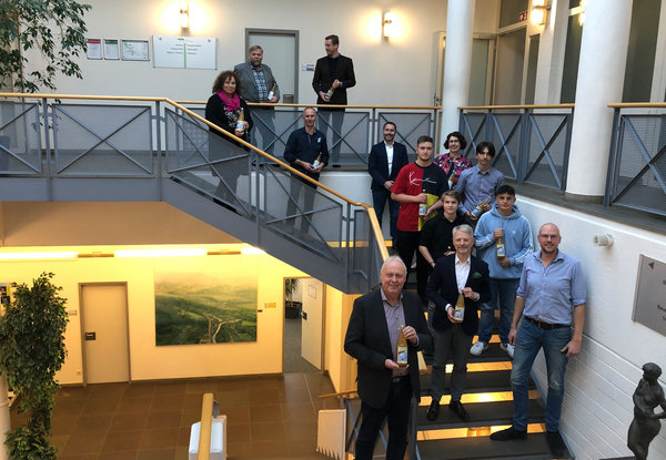[Schüler und Lehrer der Sekundarschule sowie Vertreter der Kommune und der Stiftungen freuten sich gemeinsam über die Erträge und die Planungen der Streuobstwiese.]