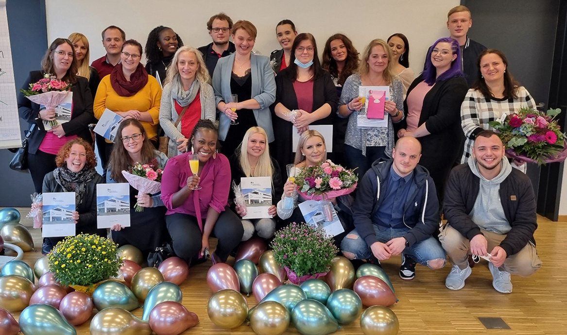 43 Teilnehmer haben ihre Altenpflegeausbildung bei der Akademie Gesundheitswirtschaft und Senioren (AGewiS) erfolgreich beendet. Betriebsleiter Klaus Grootens und Nicole Meyer, Akademieleiterin, gratulieren den Absolventen zu ihren Abschlüssen. Gleichzeitig wurden 50 neue Teilnehmer begrüßt, die im Oktober ihre Altenpflegeausbildung in der AGwiS begonnen haben. Auch die neuen Kurse bieten eine dreijährige generalistische Pflegeausbildung mit dem Abschluss Pflegefachfrau/Pflegefachmann oder wahlweise mit dem Abschluss Altenpflegerin/ Altenpfleger bei altersspezifischer Spezialisierung im dritten Ausbildungsjahr.