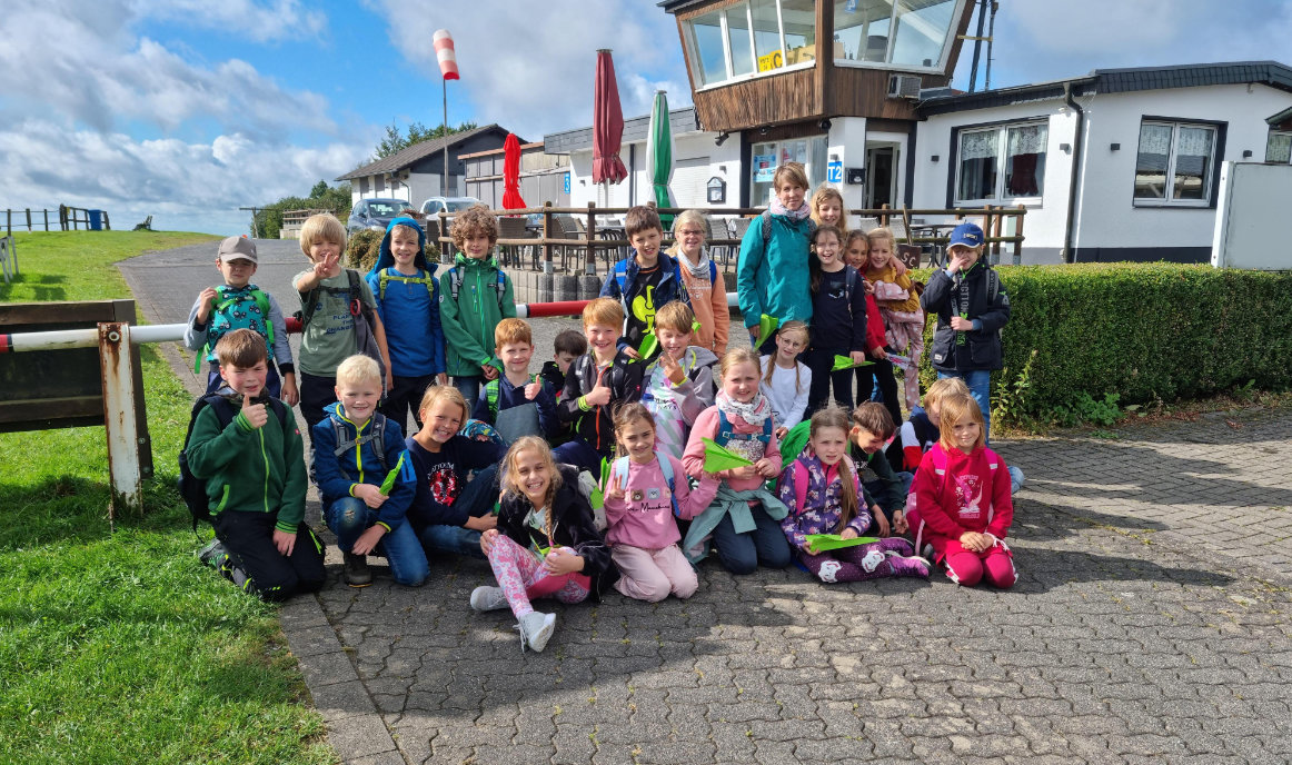 Die Lehrerinnen Carina Erdmann und Julia Garn hatten das Ziel der diesjährigen Herbstwanderung der Klassen 4a und 4b der Gemeinschaftsgrundschule Wiedenest (GGS) mit ihren Schülern schnell festgelegt. Gemeinsam machten sie sich auf, die 220 Meter Höhenunterschied zwischen der Grundschulgebäude und dem Flugplatz Dümpel zu überwinden. Nach gut anderthalb Stunden Fußweg erreichten sie ihr Ziel.
