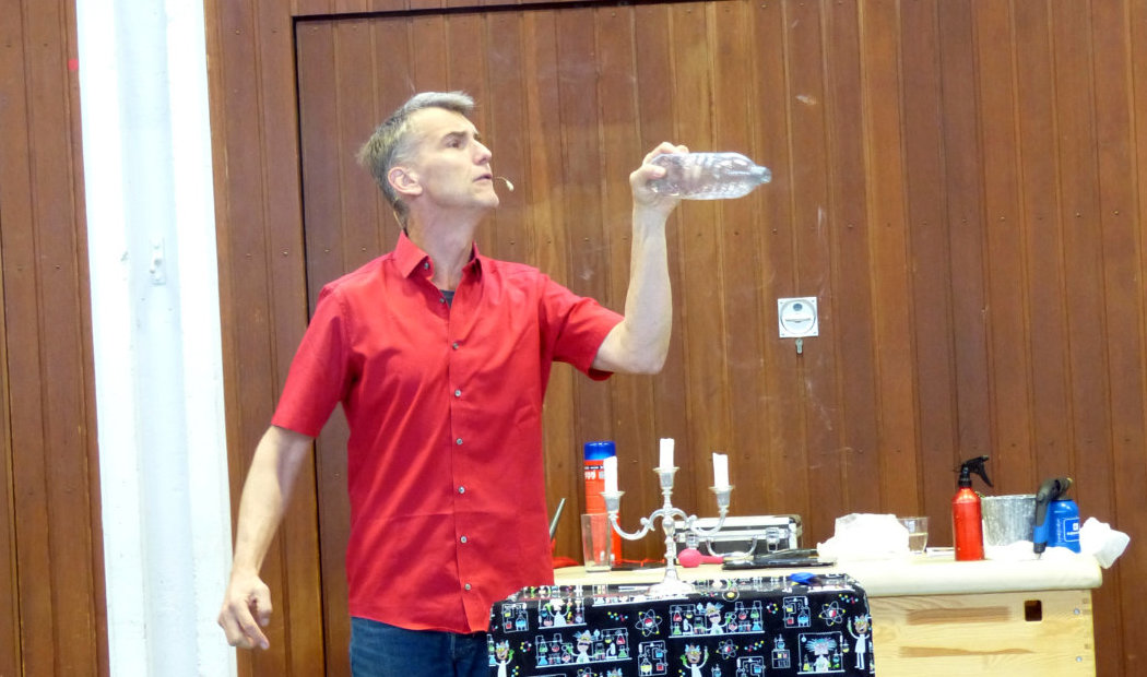 Kürzlich qualmte und zischte es in der Turnhalle der Peter von Heydt Grundschule in Reichshof-Hunsheim. Der Physiker und Wissenschaftsjournalist Sascha Ott zeigte mit den einfachsten Gegenständen wie einem Glas Wasser, einem Pappdeckel oder einer Plastikflaschenrakete verschiedene Experimente. Die Kinder lernten, wie sie gegen die Erdanziehung ankommen können, was die Fliehkraft bewirkt und wie man sich einen niedrigen Druck zunutze machen kann.