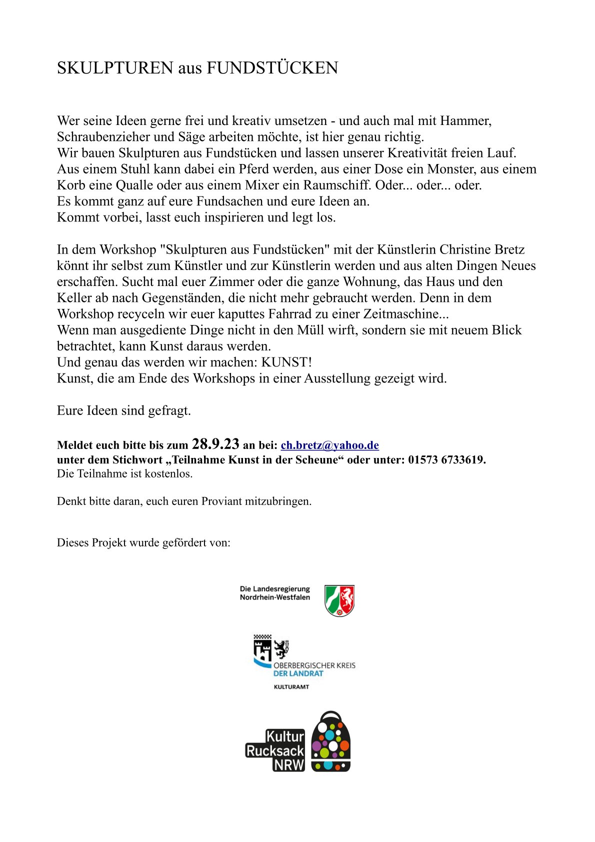 Christine Bretz bietet in der "Lebendigen Scheune Oberholzen" während der Herbstferien den Workshop "Skupturen aus Fundstücken" an, zu dem sich interessierte Kinder und Jugendliche im Alter zwischen zehn und 14 Jahren bis zum 28. September anmelden können. Der Workshop findet in der ersten Ferienwoche vom 2. bis 6. Oktober, jeweils von 11 bis 16 Uhr im Rahmen des Förderprogramms "Kulturrucksack" statt. Die Teilnahme ist kostenlos. Weitere Informationen gibt es hier.