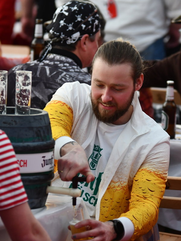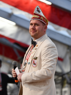 Genau jener Philip Caucal (Foto rechts) eröffnete pünktlich um 13:30 Uhr die Veranstaltung, begrüßte die jecken Männer und rief zunächst den Elferrat samt Sitzungspräsident Markus Günther auf die Bühne. Dank neuer Hüfte zeigte sich der Sitzungspräsident recht agil, nahm mit seinen Mannen Platz und beschwor zugleich das rappelvolle Zelt auf die folgenden sechs Stunden Programm ein, die nun folgen sollten. „Mit den Mädels kann man das nicht machen, aber ihr Kerle habt euch mehr Redner gewünscht. Dem Wunsch kommen wir heute nach, wir haben gleich drei am Start“, erklärte Günther und bat das Publikum, diesen Beiträgen doch bitte aufmerksam zu folgen. Vorab marschierten die diesjährigen Tollitäten, Prinz Sandra I., Bauer Manu und Jungfrau Gabi, mit großem Gefolge auf.
