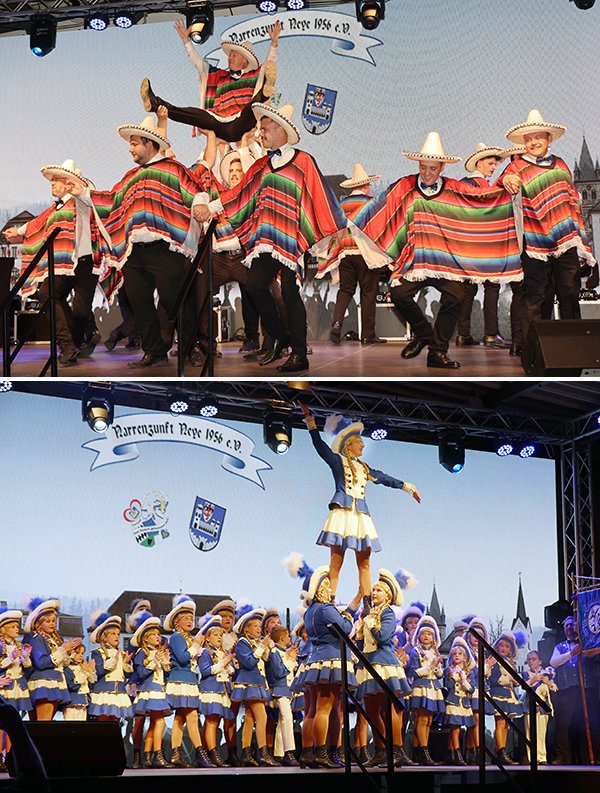 Bestens gelaunt und bewegungsaktiv zeigten sich auch die Abordnungen befreundeter Karnevalsvereine. Der Festausschuss Wermelskirchen-Dabringhausen war mit 50 Aktiven der „Jecken Wiever“, der „Grünewalder“, des „Allerleis“, der „Altstadtgarde“ und „Rut-Wieß Wermelskirchen“ in einem eigens angemieteten Bus angereist. Das Komitee Lenkelner Karneval feierte mit Abordnungen der KG Rot-Weiß Lindlar, des KV Rot-Weiß Fenke und der Sünger Butzen aus Hartegasse mit.