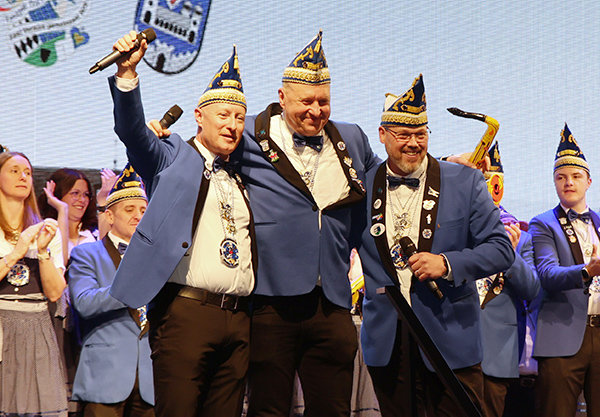Prinz Uli I. dankte auch im Namen von Bauer Lars und Jungfrau Lisbeth allen Vereinsmitgliedern, den Tanzgruppen und jedem, den sie in ihrer Session kennengelernt und begleitet hatte, für viele Gänsehaut-Momente und auch das ein oder andere Tränchen der Rührung, dass geflossen war. Besonders stolz sei er darauf, dass mit seinem Patenkind Till die Narrenzunft Neye nunmehr das erste Vereinsmitglied mit Trisomie 21, dem so genannten Down-Syndrom, in den eigenen Reihen begrüßen dürfe. Nachdem das Dreigestirn den wohlverdienten Prinzenorden als Anerkennung für die Leistungen in seiner Session erhalten hatte, nahmen sie mit ihrem Sessionslied „Über sieben Dörfer musst Du gehen“ sichtlich bewegt Abschied.