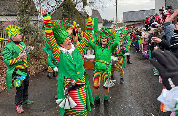 Als erste Gruppe hinter dem Ankündigungswagen von Markus Birk, sorgte der Windecker „Samba Wind“ für mächtig akustischen Wirbelwind und lockeren Hüftschwung im Publikum. Dass die 15-köpfige Rhythmusgruppe teilweise unter Anleitung eines professionellen Samba-Musiklehrers übt, wurde in der mitreißenden Performance deutlich, die dem „Trillerpfeifen-Takt“ von Dirigentin Jutta Michail perfekt folgte. Aus dem Hauptort war die Waldbröler Karnevalsgesellschaft, samt ihrer jecken Hoheit Emely I. und allen Garden angereist, die, wie alle anderen 500 Gäste auf Höhe des Dorfgemeinschaftsheims von Moderator Jörg Tietz mit einem „dreifachen Schürmich ruck zuck“ willkommen geheißen wurden. Ehrensache auch die Teilnahme der befreundeten Karnevalsvereine aus Eckenhagen, Wildberg, Herchen, Morsbach und Bielstein, die „Schürmich“ mit Tanzgarden, offiziellen Repräsentanten und Regenten die Ehre gaben.