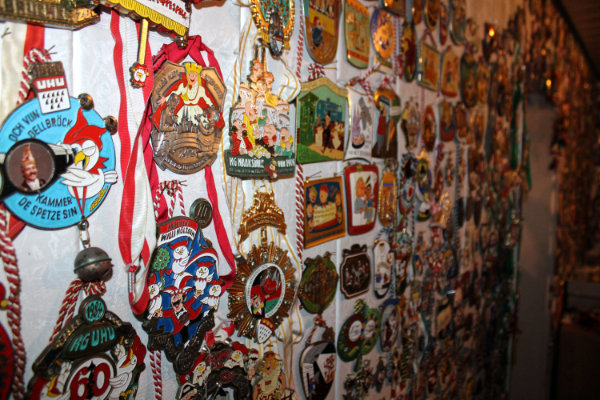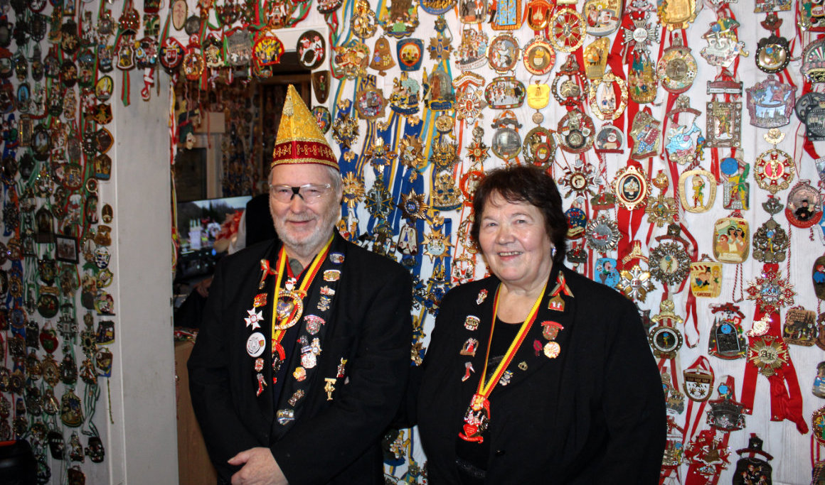 Zwischen 4.000 und 5.000 Karnevalsorden haben Schulz und di Berardino, die früher beim Kölner Rosenmontagszug zu den Stammgästen gehörten und dort auch als Wagenengel fungierten, inzwischen zusammengetragen und die Kellerräume damit ausstaffiert. „Ich sammle schon seit 50 Jahren“, berichtet Schulz, der seine Partnerin mit dem Hobby angesteckt hat.