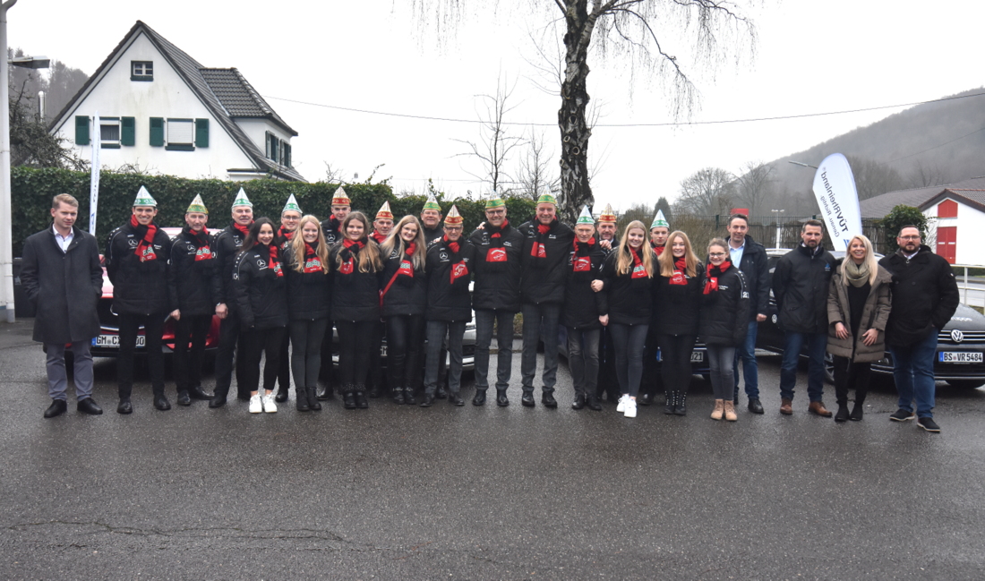 Einen Tag vor ihrer Proklamation wurde das Dreigestirn der Session 2019/2020, Prinz Bernd I., Bauer Rainer und Jungfrau Steffi, durch die Vertreter der Engelskirchener Autohäuser mobil gemacht. Lars Jensen vom Autohaus Kaltenbach fuhr mit einem Volvo vor, das Fahrzeug von David Borschbach vom Autohaus Stein trägt ein VW-Emblem im Kühler. Bernd Lurz vom gleichnamigen Autohaus steuert einen Ford dazu und Dirk Wedding wird als Strafen- und Fuhrparkadjutant seinen eigenen Mazda in den nächsten Wochen des öfteren zu sehen bekommen. TÜV-Gebietsleiter Daniel Pötsch, Bereichsleiter Björn Neumann und TÜV-Mitarbeiterin Birgit Cirolini freuten sich über den Besuch, zu dem sich auch Senatspräsident Reinhold Müller und Armin Gries, Vorsitzender der KG, gesellten.